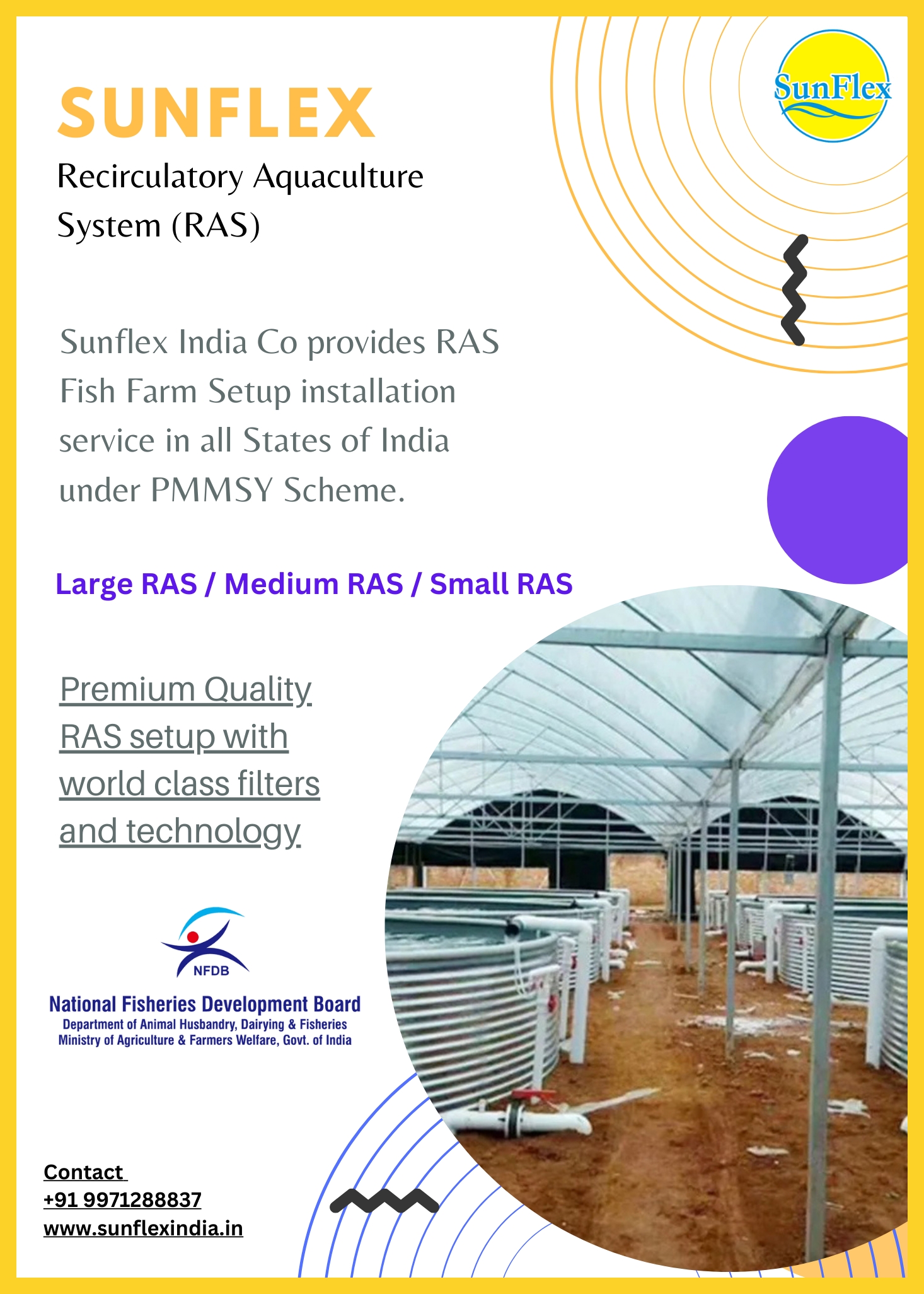 Sunflex India Co Providesfull package design for any of the RAS Project under PMMSY — Small, Medium and Large Setup. Our RAS Plant is Installed with world class filtrations Machineries and Provides a Perfect solution for decentralized fish farming project.
